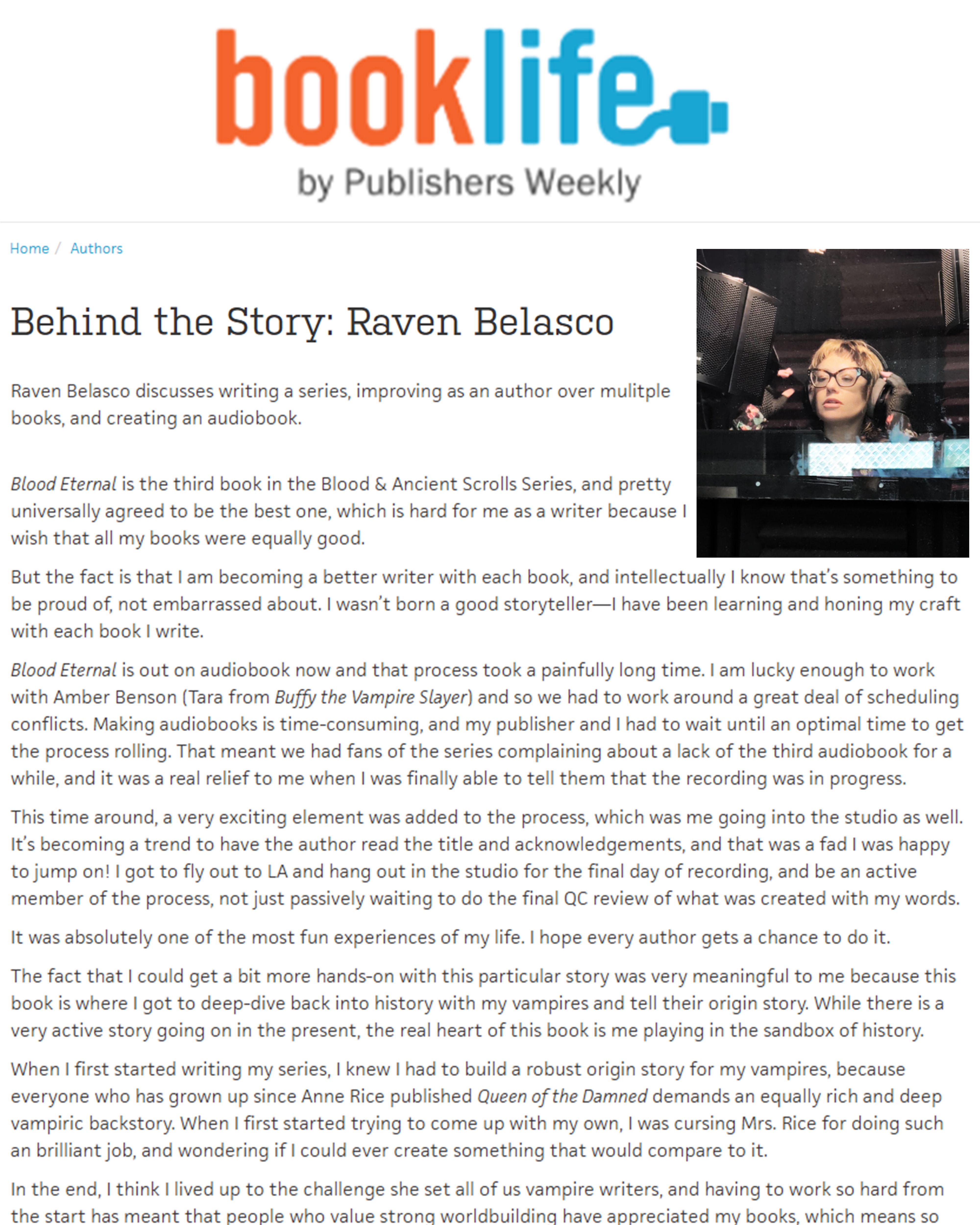 Just as I was starting to pull together the Blood Eternal marketing stuff, I saw a note from Publisherâs Weekly Booklife, offering authors a chance to submit a piece for their new segment, âBehind the Story.â So one afternoon, when I had an awkward period of time between my momâs appointments, I bashed one out, polished it up, and sent it over.